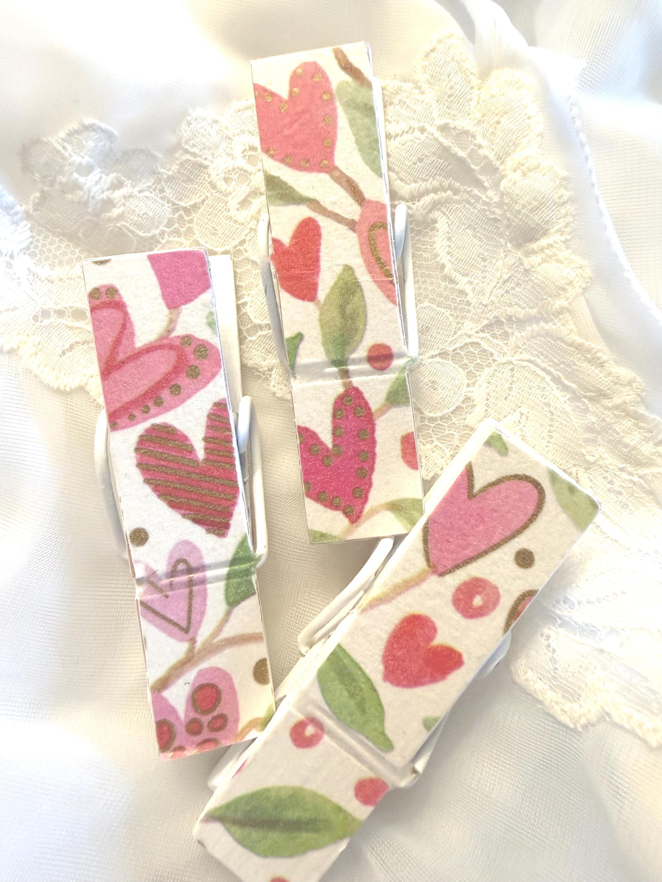 Each clip is crafted using paper, decorative tape, or napkins. Unless otherwise noted, the design is featured on both sides. They're sealed with multiple coats of protective finish for durability and easy wipe-clean care.